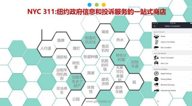國外的案例包括紐約的政府信息和投訴服務的一站式商店,不管是老鼠太多了,還是下水道里面有噪音,都可以給你提供一個入口和分類,大家就根據(jù)你的入口提供一些建議和投訴統(tǒng)一給他進行反饋。