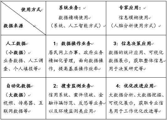 將兩類數(shù)據(jù)來(lái)源(人工數(shù)據(jù)、自動(dòng)化數(shù)據(jù))與兩類應(yīng)用(系統(tǒng)業(yè)務(wù)模式、專家應(yīng)用模式)組合起來(lái),即可得到四種數(shù)據(jù)的收集與使用狀況: