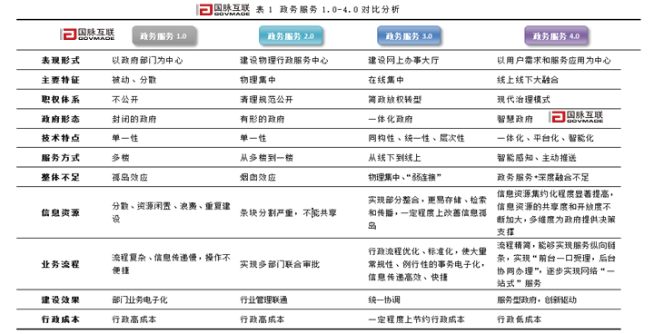 下表將圍繞表現(xiàn)形式、主要特征、職權(quán)體系、政府形態(tài)、技術(shù)特點(diǎn)、服務(wù)方式、整體不足、信息資源、業(yè)務(wù)流程、建設(shè)效果、行政流程11個(gè)方面,對(duì)政務(wù)服務(wù)1.0到政務(wù)服務(wù)4.0進(jìn)行對(duì)比分析。