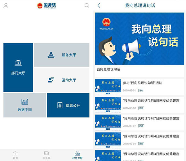 2016年2月,定位于發(fā)布政務(wù)信息和提供在線服務(wù)的新媒體平臺國務(wù)院客戶端開通上線,中央人民政府走近了公民的"身邊",界面清新、訪問流暢、交互性強,億萬公民可以通過這個APP第一時間掌上獲取各種政務(wù)信息、國務(wù)院動態(tài)、領(lǐng)導(dǎo)人觀點……客戶端的開通創(chuàng)新了政務(wù)信息公開方式、擴大了政務(wù)公開參與渠道。其中"我向總理說句話"圍繞民生領(lǐng)域羅列了簡政放權(quán)、宏觀調(diào)控、互聯(lián)網(wǎng)+、教育公平等多個分類,網(wǎng)民可以選取關(guān)心的話題向總理建言獻策,客戶端也對每日優(yōu)秀建言進行了及時整理與公開,"與總理對話"現(xiàn)已成為億萬網(wǎng)民最火熱的政民互動方式。