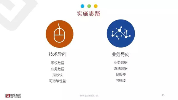 第二個就說實(shí)施的思路。那現(xiàn)在我們在其他地方做的過程中發(fā)現(xiàn)目前主要有兩種思路,一個是技術(shù)導(dǎo)向去做,第二個是業(yè)務(wù)導(dǎo)向去做。技術(shù)導(dǎo)向就是與部門核心業(yè)務(wù)或者說數(shù)據(jù)相關(guān)的一切的以系統(tǒng)和數(shù)據(jù)庫去入手。那首先在通過這個系統(tǒng)數(shù)據(jù),我們再去倒推這個系統(tǒng)數(shù)據(jù)由哪個業(yè)務(wù)數(shù)據(jù)產(chǎn)生的。這樣技術(shù)導(dǎo)向去做有一個好處就是見效快。因?yàn)檫@個數(shù)據(jù),都是已經(jīng)在系統(tǒng)里面的是可以很快拿到的。但是它的可持續(xù)性差,因?yàn)橛行I(yè)務(wù)可能是還沒有形成應(yīng)用系統(tǒng),可能現(xiàn)在是人工或者紙制的手段在操作的,那未來他有這種應(yīng)用系統(tǒng)的時候。那么整個這一塊可能要去重新梳理或者說重新改版。