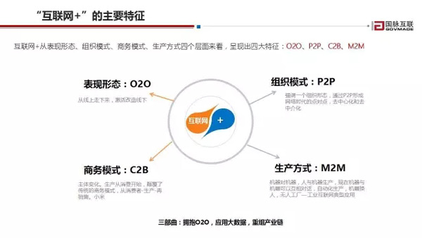 “互聯(lián)網(wǎng)+”從表現(xiàn)形態(tài)、組織模式、商務(wù)模式和生產(chǎn)方式四個(gè)層面來看,呈現(xiàn)出四大特征,如下圖: