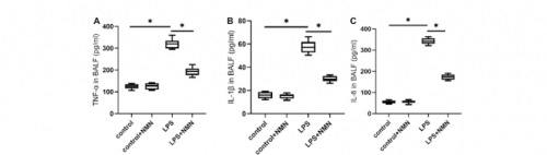 為了評估肺部炎癥,研究人員測量了稱為細胞因子的分子。一些最常見的與炎癥相關(guān)的細胞因子、TNF-α、IL-1β 和IL-6在膿毒癥模型小鼠的肺液中升高。然而,NMN治療降低了所有三種促炎標志物的蛋白質(zhì)水平,表明NMN減少了肺部感染引起的炎癥。