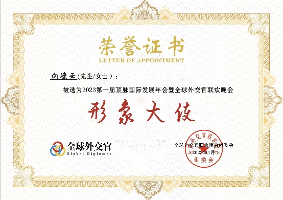 鑒于著名經(jīng)濟(jì)學(xué)家向凌云教授,多年來(lái)默默無(wú)聞致力服務(wù)全球外交活動(dòng),向多國(guó)提供經(jīng)濟(jì)援助并進(jìn)行金融與經(jīng)濟(jì)顧問(wèn)工作,為多國(guó)駐華使館及外交活動(dòng)提供一系列的便利及幫助,為我國(guó)的外交活動(dòng)做出了應(yīng)有的貢獻(xiàn)。經(jīng)組委會(huì)一致決定,在2023全球外交官活動(dòng)中授予向凌云“全球外交官形象大使”榮譽(yù)稱號(hào)。