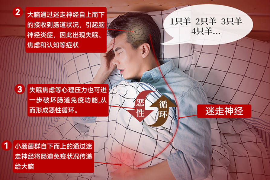 小腸菌群可通過菌-腸-腦軸自下而上把腸道免疫力的狀況傳遞給大腦并影響個體行為,如情緒、失眠、焦慮和認(rèn)知。大腦也可通過腦-腸-菌軸自上而下的影響腸道免疫,即失眠焦慮等心理壓力也可進(jìn)一步破壞腸道免疫功能(*1)。進(jìn)入一種惡性循環(huán)的狀況。