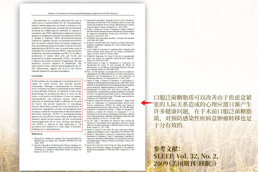 (備注:慢性心理應(yīng)急能擾亂人體免疫、神經(jīng)精神性及內(nèi)分泌系統(tǒng)的平衡穩(wěn)態(tài),從而損害健康并誘發(fā)多種疾病??诜壕侵|(zhì)可改善由于焦慮和緊張的人機(jī)關(guān)系造成的心里應(yīng)急日漸產(chǎn)生的許多健康問題。在手術(shù)前口服泛菌糖脂質(zhì),對預(yù)防感性性疾病和腫瘤轉(zhuǎn)移也是十分有效的