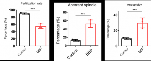 非整倍性染色體數(shù)量異常是流產(chǎn)和發(fā)育障礙的主要原因。非整倍性被認為是卵母細胞衰老的標志,因為它隨著年齡的增長而增加50%。導致非整倍體的衰老卵母細胞的另一個特征是紡錘體不良幫助平均分裂染色體的蛋白質(zhì)組織。研究人員發(fā)現(xiàn),來自BBP暴露小鼠的卵母細胞增加了紡錘體紊亂和非整倍性。