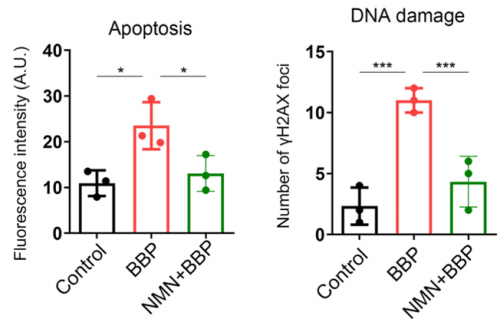 隨著年齡的增長,氧化應激會導致DNA損傷,積累并導致進一步的減少,從而加劇衰老。此外,當受損線粒體的電壓達到特定閾值時,細胞死亡被激活。研究人員發(fā)現(xiàn),BBP暴露小鼠的卵母細胞中細胞死亡和DNA損傷均增加。此外,NMN防止了這兩種老化特征的發(fā)生。