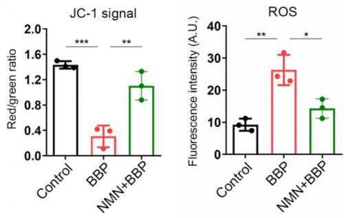 不健康的線粒體會產(chǎn)生過量的活性氧(ROS)。ROS與蛋白質(zhì),脂肪和DNA反應,對細胞造成損害,這一過程稱為氧化應激。像線粒體功能障礙一樣,氧化應激是細胞衰老的普遍標志。研究人員發(fā)現(xiàn),來自BBP暴露小鼠的卵母細胞具有增加的ROS水平,NMN將其降低到正常水平。
