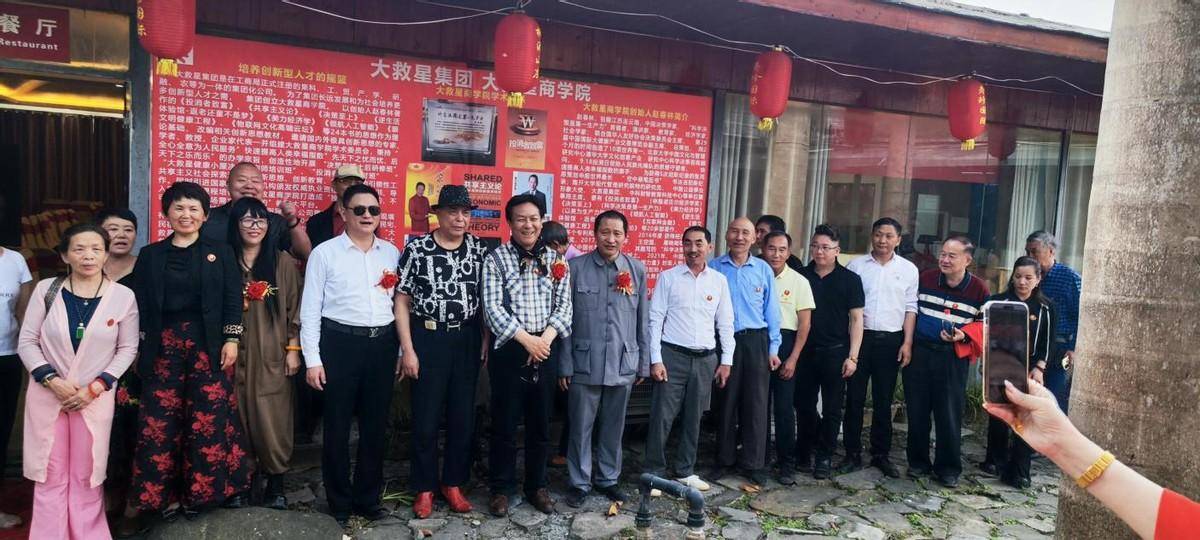 出席大救星商學(xué)院揭牌儀式的部分嘉賓在商學(xué)院展示牌前合影