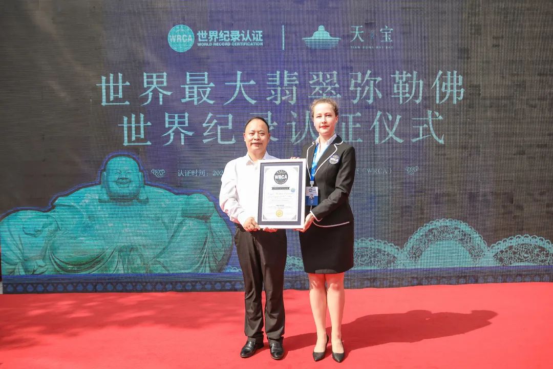 彌勒佛又稱未來佛,代表著歡喜、包容、慈悲和未來可期。這尊2021年獲得世界紀(jì)錄權(quán) 威認(rèn)證機(jī)構(gòu)(WRCA)認(rèn)證的世界最 大翡翠彌勒佛,原石重達(dá)19.7噸,經(jīng)由工藝美術(shù)大師趙敏及其團(tuán)隊(duì)歷時4年雕刻而成。