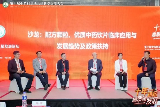 在沙龍環(huán)節(jié),由天津中醫(yī)藥大學(xué)第二附屬醫(yī)院院長雒明池,上海中醫(yī)藥大學(xué)附屬龍華醫(yī)院院長陳躍來,甘肅中醫(yī)院院長張志明,山東中醫(yī)藥大學(xué)附屬醫(yī)院大學(xué)城醫(yī)院院長賈新華,上海中藥行業(yè)協(xié)會執(zhí)行會長、國家中藥材標(biāo)準(zhǔn)化與質(zhì)量評估創(chuàng)新聯(lián)盟副理事長楊弘,新綠色藥業(yè)副總經(jīng)理王友利就“配方顆粒、優(yōu)質(zhì)中藥飲片臨床應(yīng)用與發(fā)展趨勢及政策扶植”展開討論。賈新華院長向新綠色藥業(yè)在疫情期間作出的突出貢獻(xiàn)表示衷心的感謝,他特別提到去年上海疫情,新綠色藥業(yè)第 一時間遠(yuǎn)程調(diào)配“流動應(yīng)急智能中藥房”,解決了封控期間用藥的問題。彰顯了新綠色藥業(yè)共克時艱,同心戰(zhàn)“疫”的責(zé)任與擔(dān)當(dāng)。新綠色藥業(yè)副總經(jīng)理王友利論述了中藥配方顆粒行業(yè)發(fā)展?fàn)顩r及目前存在的困境。