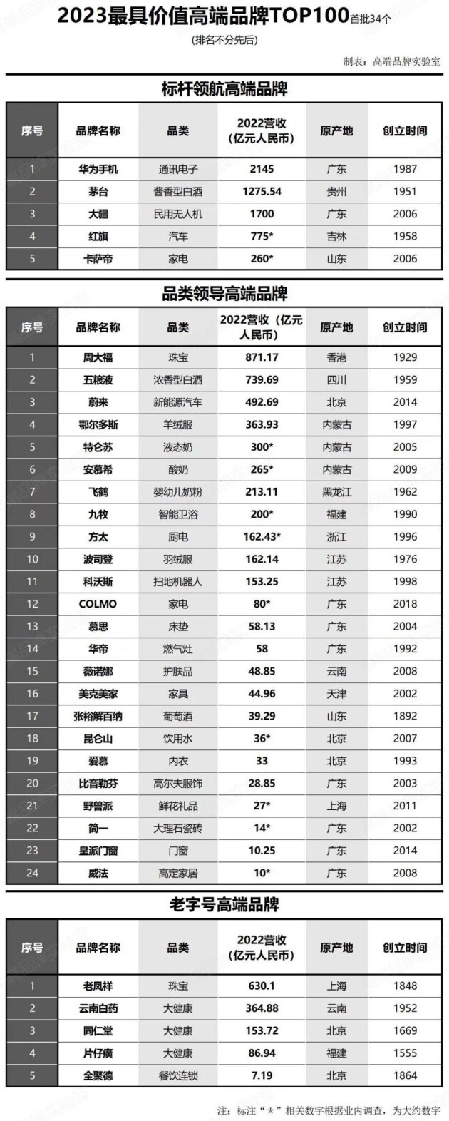 它們分別是:進(jìn)入標(biāo)桿領(lǐng)航榜的華為手機(jī)、茅臺、卡薩帝、大疆和紅旗等5個品牌;進(jìn)入“品類領(lǐng) 導(dǎo)品牌榜”的則有24個品牌,它們分別是各自品類的領(lǐng)導(dǎo)品牌:五糧液、慕思、方太、COLMO、鄂爾多斯、蔚來、周大福、波司登、特侖蘇、九牧智能衛(wèi)浴、華帝時尚廚電、簡一大理石瓷磚、愛慕內(nèi)衣、比音勒芬、美克美家、威法定制、皇派門窗、安慕希、飛鶴、昆侖山、張?jiān)=獍偌{、科沃斯、薇諾娜、野獸派等。此次,該榜單還對老字號品牌進(jìn)行了特別關(guān)注,首批進(jìn)入“老字號品牌榜”的老鳳祥、云南白藥、同仁堂、片仔癀、全聚德等5個品牌,顯示,老字號在進(jìn)行高端化進(jìn)程中同樣可以綻放絢麗的光彩。