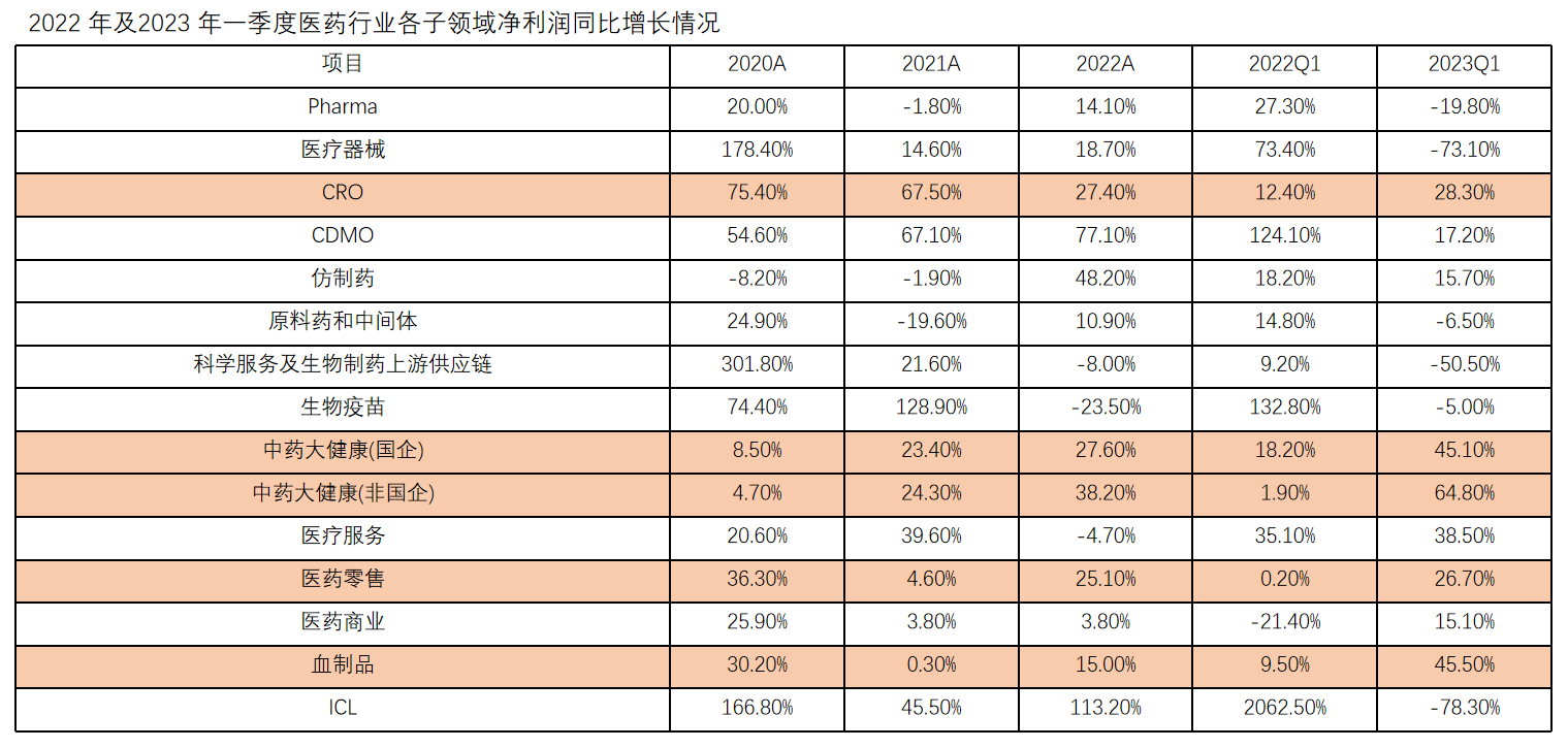 第 一個數(shù)據(jù)是根據(jù)醫(yī)藥企業(yè)上市公司的年報數(shù)據(jù)做出的統(tǒng)計,可以看到在醫(yī)藥行業(yè)的細分產(chǎn)業(yè)里,CRO和醫(yī)藥零售的數(shù)據(jù)表現(xiàn)明顯是要好過于其他領域,在上游研發(fā)和下游銷售都有較好表現(xiàn)的情況下,制藥回暖是有較大支撐的。不同于其他行業(yè),制藥上下游的增長能帶動中游,而非中游制藥的不景氣拖累上下游。