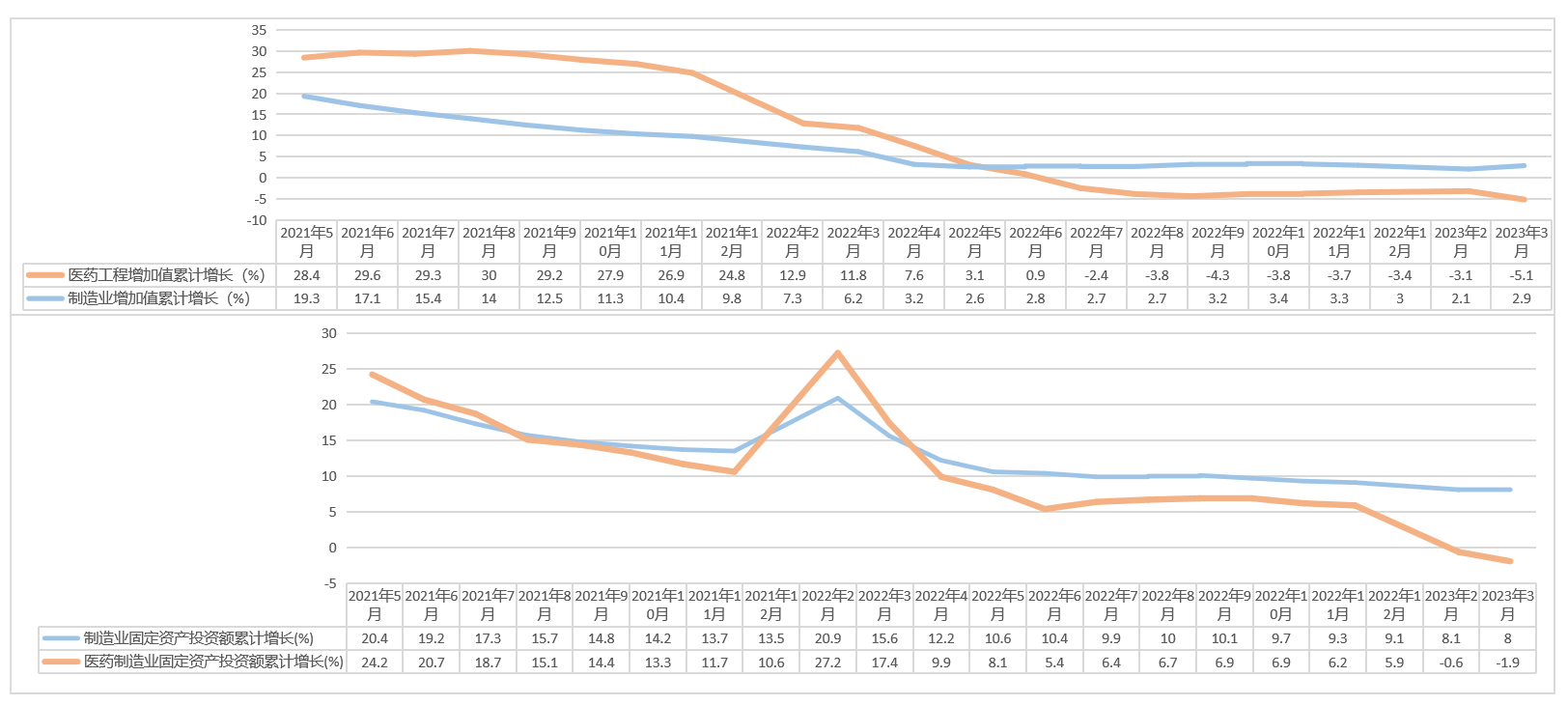 一個不得不接受的事實是制藥廠房的建設及整個制藥行業(yè),在過去的一年里發(fā)生了前所未有的大滑坡。從國家統(tǒng)計局公布的數(shù)據(jù)來看,醫(yī)藥制造業(yè)的累計增加值和固定資產(chǎn)投資累計增長這兩個數(shù)值早在2022年的5月左右就已經(jīng)低于制造業(yè)平均水平。