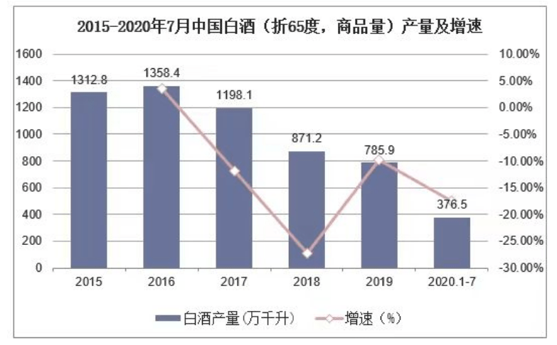醬香型白酒三種工藝對比資料來源:公開資料整理二、醬香酒行業(yè)發(fā)展現(xiàn)狀白酒產(chǎn)量方面,近年來,我國白酒產(chǎn)量整體呈下降趨勢,據(jù)國家統(tǒng)計(jì)局?jǐn)?shù)據(jù)顯示,2019年中國白酒(折65度,商品量)產(chǎn)量為785.9萬千升,同比下降9.79%,2020年1-7月,我國白酒產(chǎn)量僅有376.5萬千升,同比下降17.45%。2015-2020年7月中國白酒(折65度,商品量)產(chǎn)量及增速資料來源:國家統(tǒng)計(jì)局,華經(jīng)產(chǎn)業(yè)研究院整理醬香型白酒已成為名副其實(shí)的‘黃金產(chǎn)業(yè)’。