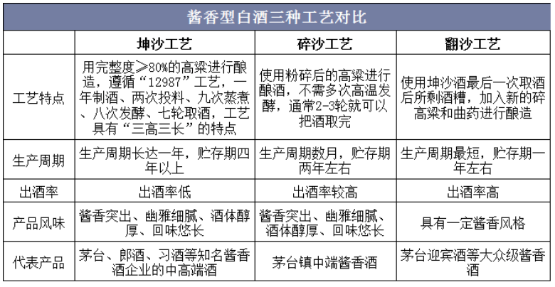 白酒香型分類資料來源:鳳凰網(wǎng),華經(jīng)產(chǎn)業(yè)研究院整理醬香型白酒工藝可以細(xì)分為坤沙、碎沙、翻沙三種,其中坤沙最具代表性。坤沙醬香酒工藝講究“三高三長”:“三高”即高溫制曲、高溫堆積發(fā)酵、高溫餾酒,“三長”即基酒生產(chǎn)周期長、大曲貯存時(shí)間長、基酒酒齡長?!叭呷L”工藝對釀酒原料、釀造時(shí)間、當(dāng)?shù)貧夂蛱卣鞯葪l件有著極高的要求,因此優(yōu)質(zhì)醬香酒產(chǎn)區(qū)被嚴(yán)格限制在赤水河流域。且“三高三長”工藝賦予了醬香酒獨(dú)特的風(fēng)味,飲后不口干、不易上頭,符合消費(fèi)者“少喝酒、喝好酒”的健康追求?!叭呷L”工藝一方面賦予了醬香酒稀缺性,另一方面使醬香酒形成獨(dú)特的風(fēng)味,從而打造了醬香酒的獨(dú)特競爭力。