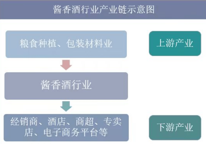 醬香型白酒行業(yè)的產(chǎn)業(yè)鏈上游主要是包裝材料行業(yè)和糧食種植業(yè);下游行業(yè)是批發(fā)與零售業(yè),主要通過經(jīng)銷商、酒店、商超、專賣店、電子商務(wù)平臺等渠道最終銷售到消費(fèi)者手中。