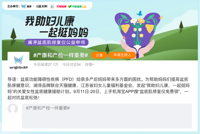 今年9月,瀾渟聯(lián)合天貓健康、阿里健康公益、江蘇省婦兒基金會(huì)四方聯(lián)合發(fā)起的線上公益活動(dòng)“我助婦兒康,一起挺媽媽”,免費(fèi)申領(lǐng)瀾渟盆底肌修復(fù)儀,總計(jì)50 臺(tái)盆底康復(fù)治療儀,兩天時(shí)間里,微博話題閱讀量超1.5億,推動(dòng)公眾對(duì)女性盆底健康問(wèn)題的關(guān)注與支持。