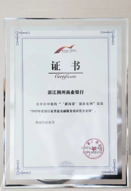浙江稠州商業(yè)銀行(下稱“稠州銀行”)的普惠金融服務(wù)案例——“浙閃貸”在數(shù)字金融和普惠金融領(lǐng)域勇于創(chuàng)新,貢獻(xiàn)突出,被列為“2023 銀行家金融創(chuàng)新成果”,在由《銀行家》雜志及銀行家金融創(chuàng)新論壇組委會(huì)主辦的“銀行家金融創(chuàng)新論壇暨銀行家金融創(chuàng)新成果發(fā)布會(huì)”上,獲評(píng)“普惠金融服務(wù)創(chuàng)新優(yōu)秀案例”。