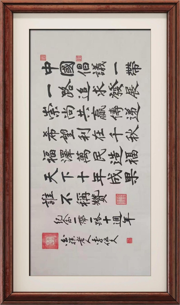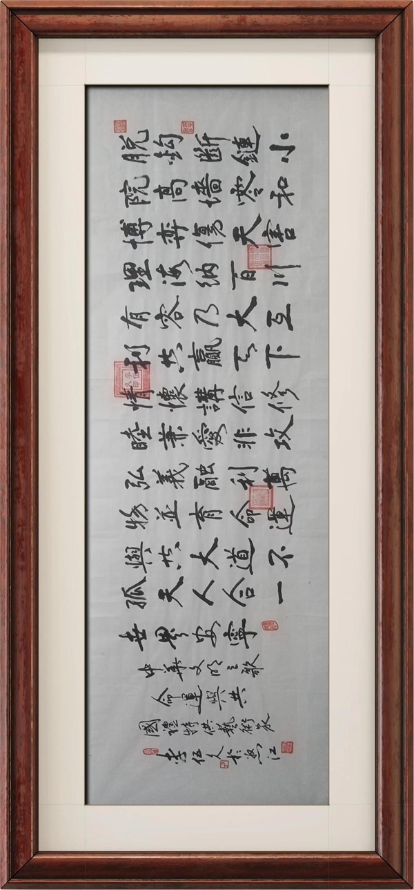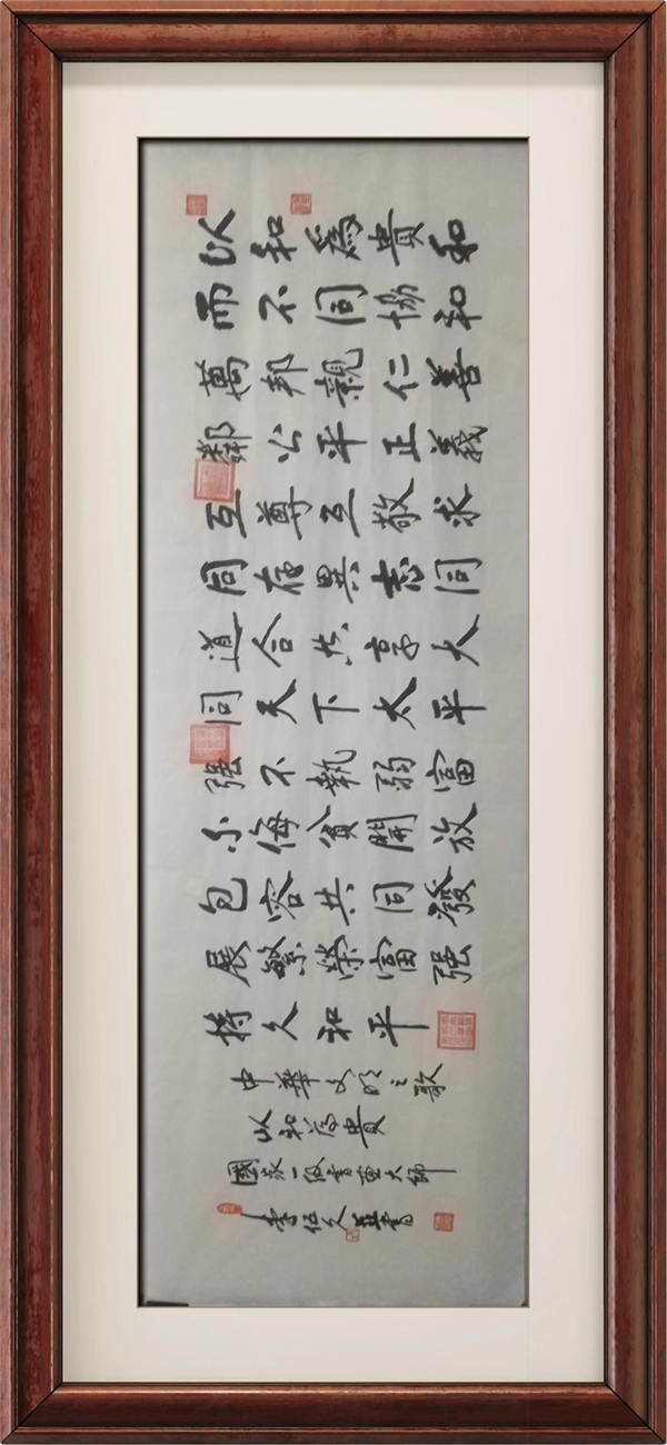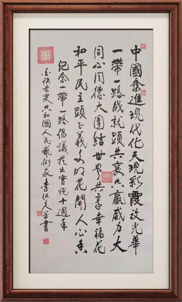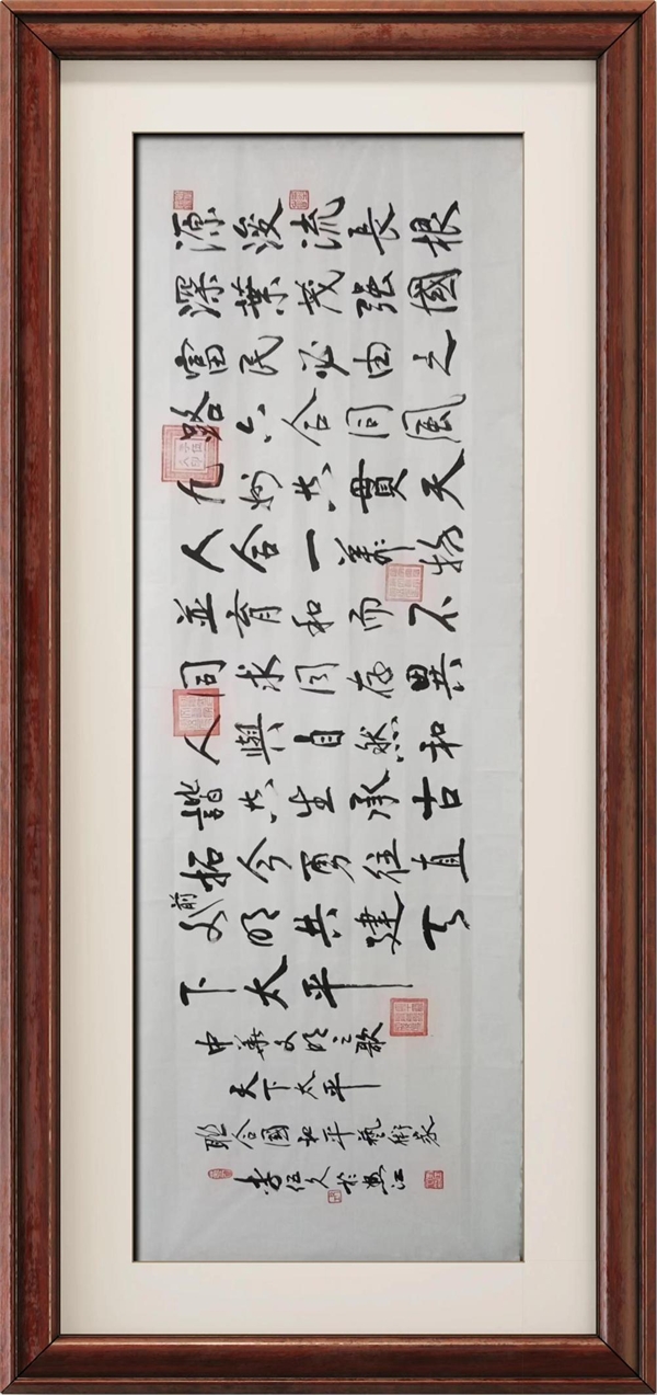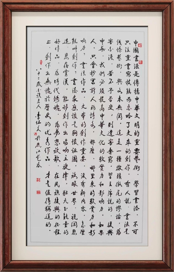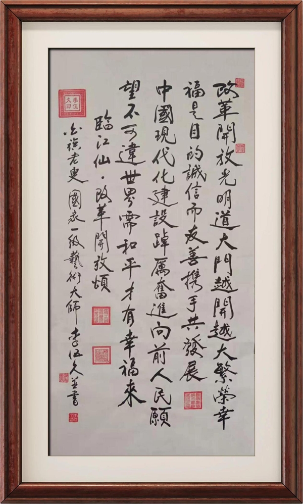 李伍久大師書法作品法度嚴(yán)謹(jǐn),神采煥發(fā),用筆圓潤豐滿,方圓兼施,無遲滯之感,結(jié)體俊美靈秀,均勻優(yōu)雅,可見大師在技法上已到達(dá)了爐火純青的地步。他以外若飛仙,飄逸灑脫,內(nèi)似硬漢,鋼筋鐵骨,一筆一劃寫出恒久的人格魅力。李大師是個(gè)承上啟下的一個(gè)重要的橋梁式人物。他是繼王羲之、顏真卿之后在中國書法史上最具影響深遠(yuǎn)的大師,堪稱藝壇巨匠,千古一人。