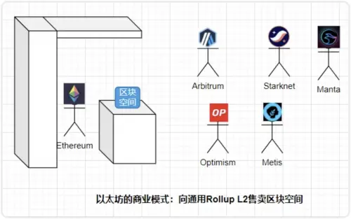 Restaking好理解,AVS理解起來有點(diǎn)復(fù)雜。要理解EigenLayer的AVS,需要首先理解以太坊的商業(yè)模式。如果從商業(yè)視角觀察以太坊主網(wǎng)與以太坊生態(tài)Rollup L2們的關(guān)系,以太坊當(dāng)下的商業(yè)模式,是向通用Rollup L2們出售區(qū)塊空間。