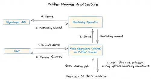 用戶質(zhì)押$ETH獲得$pufETH,Puffer的Node Operators將$ETH分為兩部分,一部分質(zhì)押給以太坊驗(yàn)證者,另一部分參與Eigenlayer的再質(zhì)押。