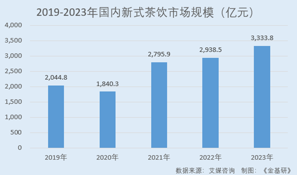 據iiMedia Research(艾媒咨詢)數據,2019-2023年,國內新式茶飲市場規(guī)模分別為2,044.8億元、1,840.3億元、2,795.9億元、2,938.5億元、3,333.8億元,年均復合增長率達26.38%。