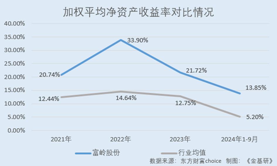 據東方財富choice數據,2021-2023年及2024年1-9月,富嶺股份的ROE分別為20.74%、33.90%、21.72%、13.85%。