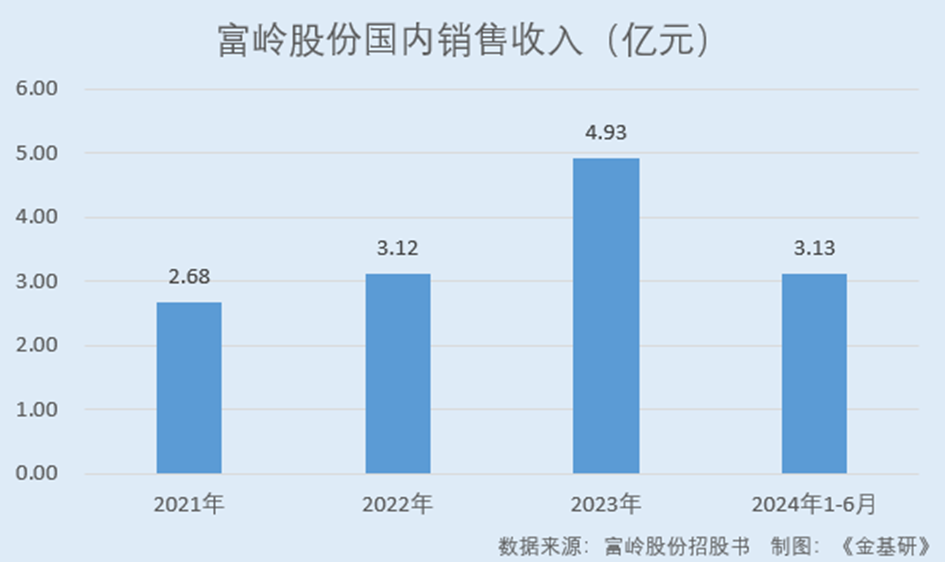 據招股書,2021-2023年及2024年1-6月,富嶺股份國內銷售收入分別為2.68億元、3.12億元、4.93億元、3.13億元,占當期主營業(yè)務收入的比例分別為18.43%、14.50%、26.24%、28.67%,整體呈穩(wěn)步增長趨勢。