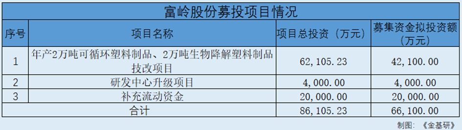 此番上市,富嶺股份擬募集資金6.61億元,分別投向“年產2萬噸可循環(huán)塑料制品、2萬噸生物降解塑料制品技改項目”、“研發(fā)中心升級項目”等項目。