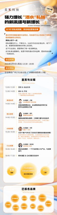 若您想更深度探討酒水私域新增長與全域運(yùn)營落地思路,可關(guān)注 9 月 5 日(本周五) 由慧博科技聯(lián)合見實(shí)舉辦的強(qiáng)力增長“酒水 * 私域”的新渠道與新增長 私享會(huì)將在廣州開展?,F(xiàn)場(chǎng)嘉賓將為與會(huì)嘉賓拆解酒飲私域增長玩法和全域?qū)崙?zhàn)案例;活動(dòng)限時(shí)免費(fèi)參加,先到先得,關(guān)注【北京慧博科技】公眾號(hào)進(jìn)行報(bào)名
