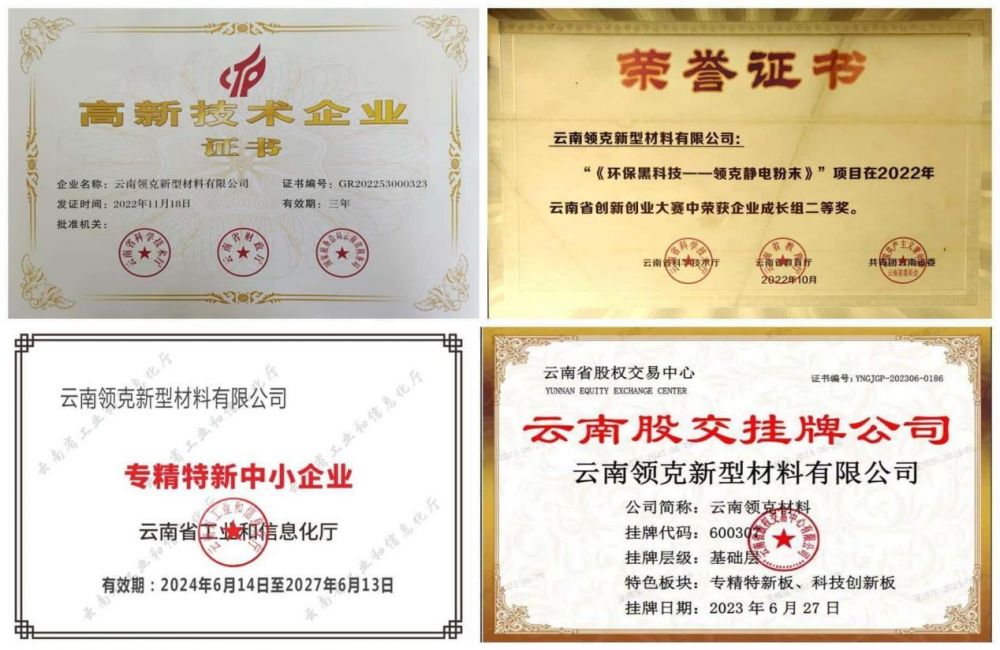在資質(zhì)榮譽方面,云南領(lǐng)克粉末更是碩果累累:不僅是國家級科技型中小企業(yè)、高新技術(shù)企業(yè),還先后獲評創(chuàng)新型中小企業(yè)、專精特新中小企業(yè),是云南省知識產(chǎn)權(quán)推動高質(zhì)量發(fā)展示范企業(yè);在行業(yè)業(yè)績評選中,公司連續(xù)兩年躋身中國粉末涂料銷售額百強企業(yè)行列,2023年度、2024年度均獲此重磅榮譽,成為云南唯一同時擁有多項行業(yè)核心資質(zhì)的粉末涂料企業(yè)。此外,公司還在云南省股權(quán)交易中心新四板掛牌,成為粉末涂料行業(yè)內(nèi)唯一的掛牌企業(yè),資本市場的認可進一步印證了其綜合實力。